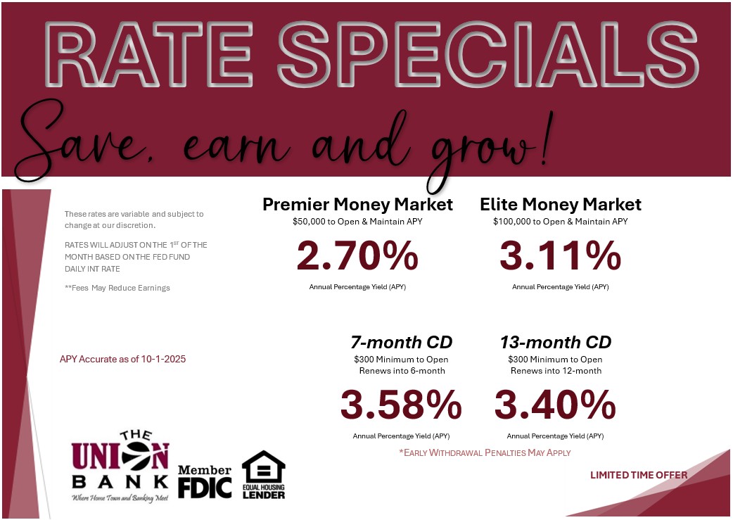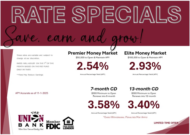 If you're in the market for a new ride - or just about any type of vehicle you can imagine - let The Union Bank help you finance it.