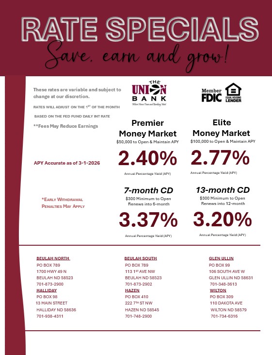 Privacy of Consumer Financial Information Notice – Federal law requires us to tell you how we collect, share, and protect your personal information. Our privacy policy has not changed and you may review our policy and practices with respect to your personal information on the Bank’s website at www.theunionbank.com. At your request, we will also mail you a free copy if you call us at 701-748-2900.