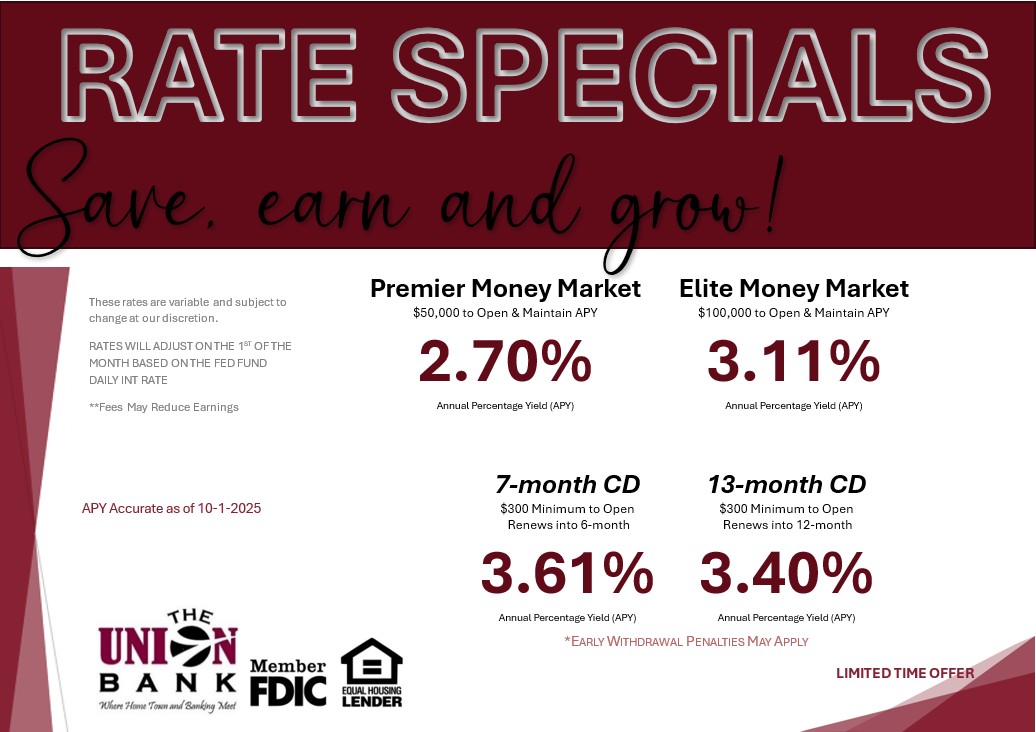 If you're in the market for a new ride - or just about any type of vehicle you can imagine - let The Union Bank help you finance it.